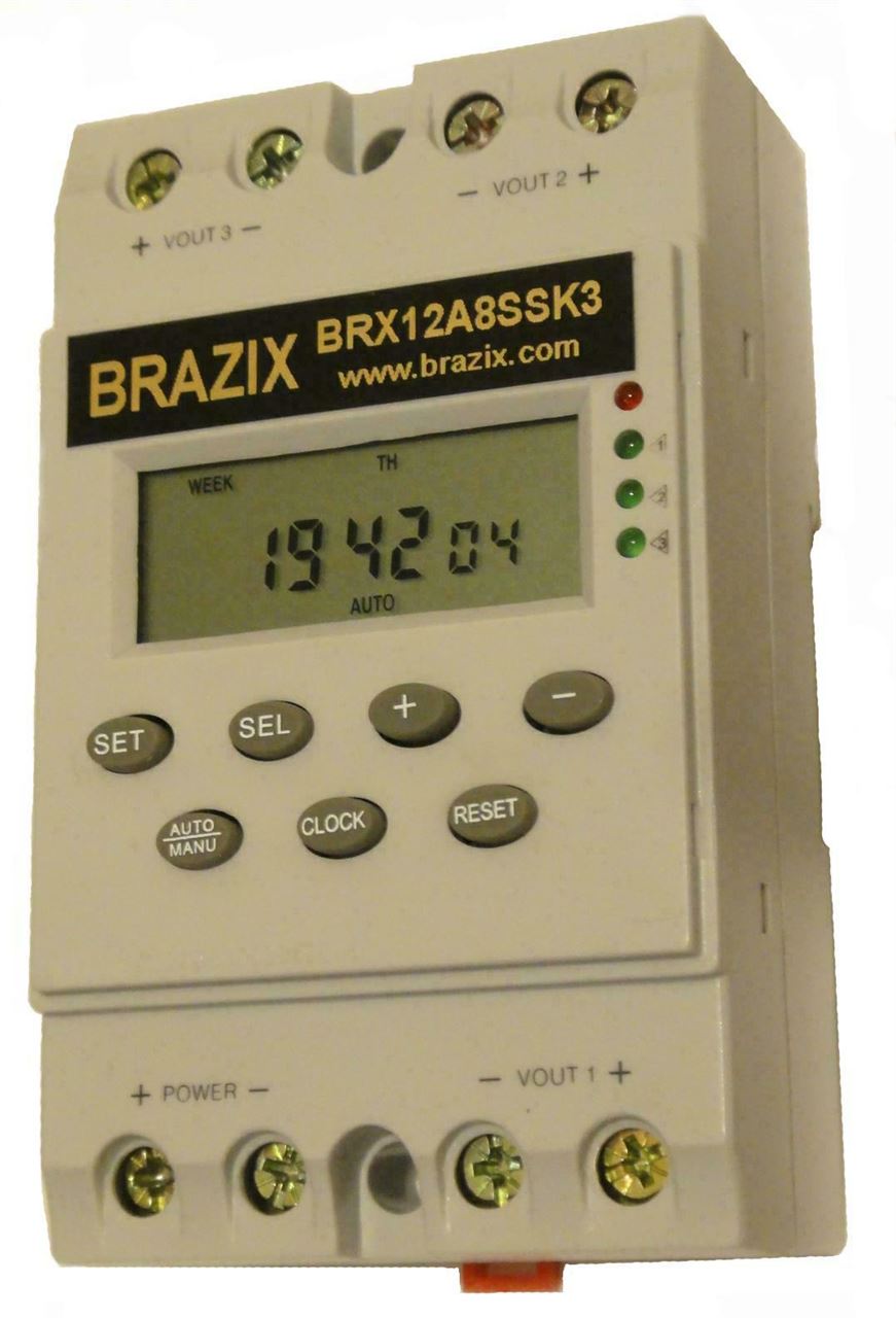 This 7 day digital programmable timer is ideal for use in any 12V DC appliance which requires automation. It can be configured to switch at up to 80 different times during a 24 hour period. In addition, it can be programmed to operate on a wide variety of days. eg. Daily, Week days only, Weekends only, Every second day, or selected group of days.The BRX12A8SSK3 allows for Switch-on and switch-off times to be set for each program. i.e. allows a different "on" duration for each program.The timer has three modes of operation. In the "auto" mode, the timer automatically switches at the pre-programmed times. In the "on" mode, the switch is always on regardless of the timer program setting. In the "off" mode, the timer will not switch regardless of the program settings. The mode of operation can only be changed when power is applied to the switch.3 CHANNELS TIMER. CONTROLS 3 INDEPENDENT DEVICES WITH INDEPENDENT SCHEDULES. SECONDS INCREMENT.In the event of a power failure, the switch retains its program data via backup battery.- Voltage: 12V DC- Max Total Load: 8A Resistive/Channel, 3 channels ≤ 20A- Standby consumption: 0.03A- Dimensions: 120mm x 72mm x 50mm- Weekly & Daily Programming.- Timing Control Range: From 1 second to 168 Hours- Up to 80 events per day or 560 events per week. Example: You can set 1 "ON & OFF" event to repeat the 7 days of the week and you will be using only 1 out of the 80 events allowed.- 80 ON and 80 OFF events can be programmed independently.- Accuracy: <±2 seconds per day- Operating temperature: +10 ~+50 C- Relative Humidity: 95%- Guide Rail & Wall mounting & Panel- Battery backup- Manual override eliminates the need for an additional helm switch.- An 8A fuse per channel is strongly recommended for each installation as it will assure a long life for the timer as it will avoid overload of the system.We ship worldwide. - Hablamos Español. - Nous parlons Français.